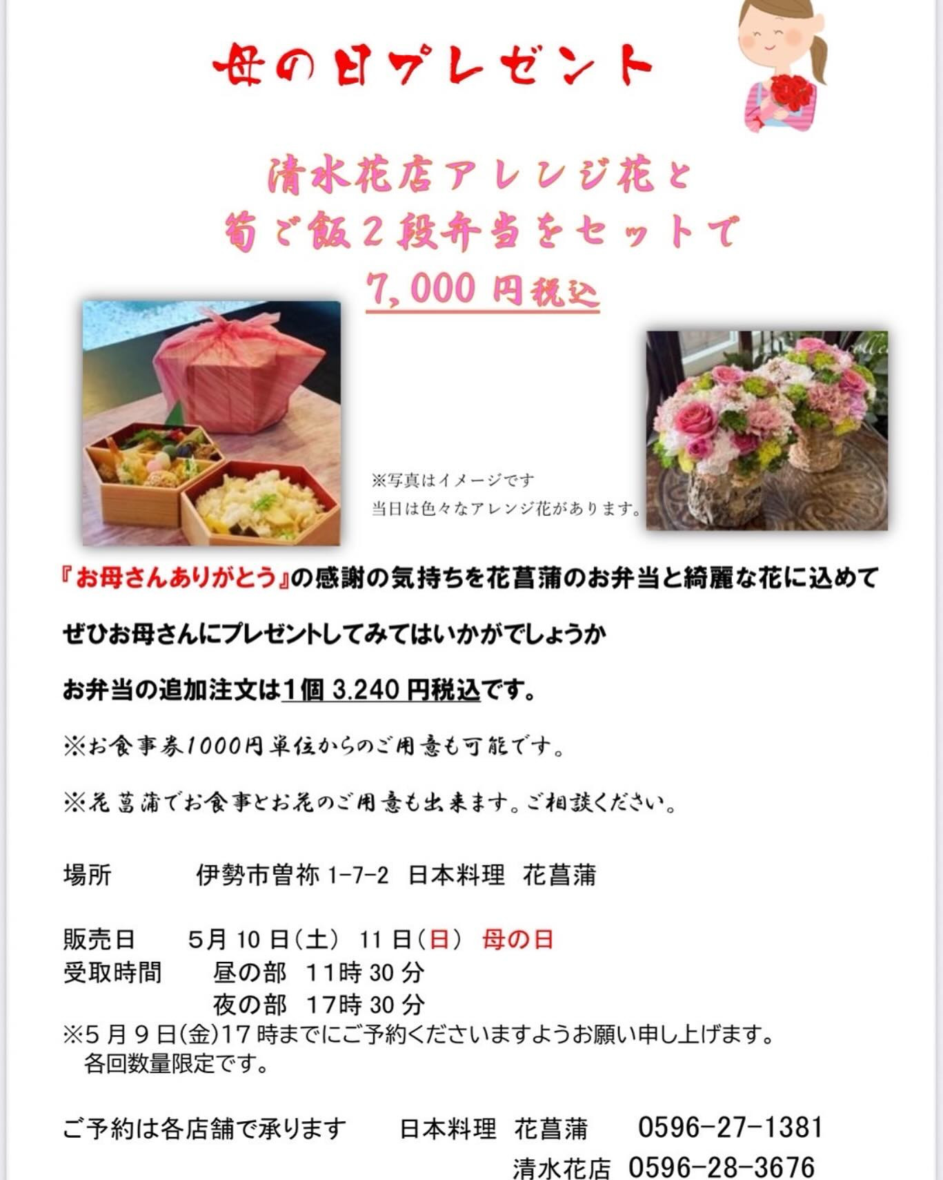 5月11日は"母の日"花菖蒲さんとコラボ商品を出させて頂きますෆ˚*お弁当とお花セットでなんと…7000円(税込)です!!なかなかないセット金額なので是非この機会をお見逃しなく.ご予約は5月9日金曜日17時ま…